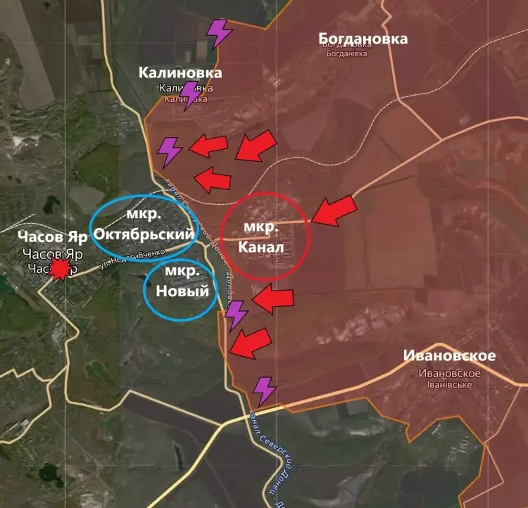 На Константиновском направлении подразделения ВС РФ продолжают выдавливать остатки сил противника с позиций к востоку от канала Северский Донец - Донбасс. Основная часть украинских формирований на нашей стороне остаётся в районе урочища Орлова, что располагается между Калиновкой и микрорайоном Канал.