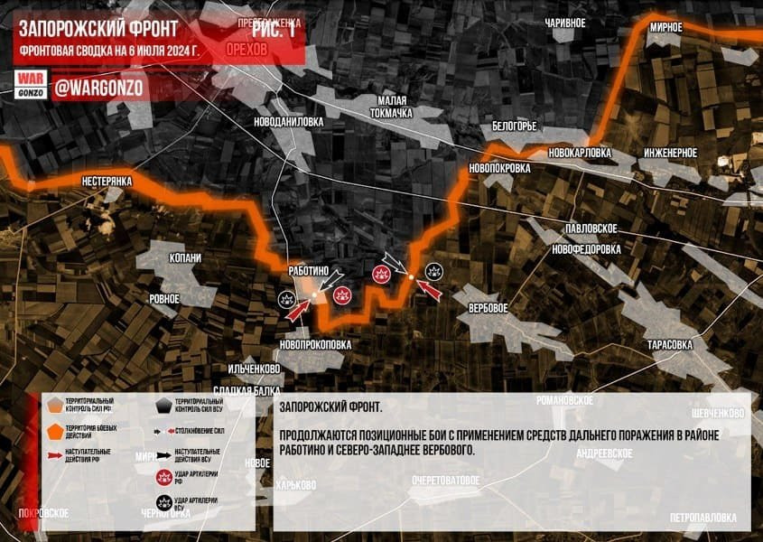 Как пишет Telegram-канал Wargonzo, на Запорожском направлении продолжаются позиционные бои с применением средств дальнего поражения в районе Работино и северо-западнее Вербового.