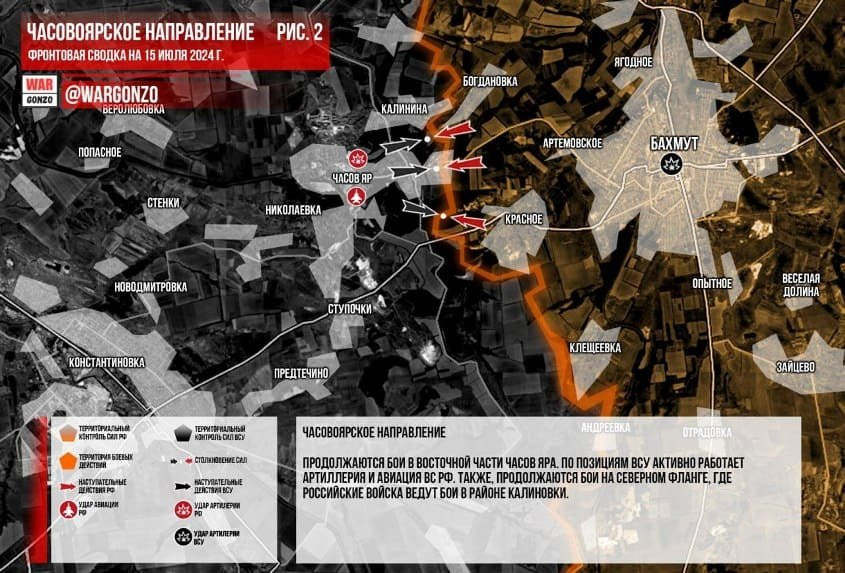 Продолжаются бои в восточной части Часов Яра. По позициям ВСУ активно работает артиллерия и авиация ВС РФ. Также, продолжаются бои на северном фланге, где российские войска ведут бои в районе Калиновки, сообщает Wargonzo.