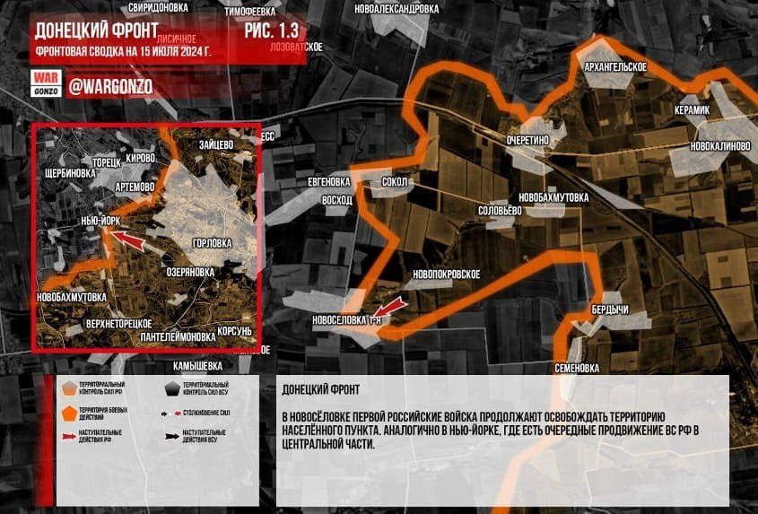 ВС РФ продолжают двигаться в Урожайном, есть очередные тактические успехи. Продолжаются бои на окраинах Константиновки. В Красногоровке ВС РФ развивают наступление, продолжая выбивать украинский гарнизон на окраины города. В районе Карловки без особых изменений, продолжаются штурмовые действия ВС РФ. В Новосёловке Первой российские войска продолжают освобождать территорию населённого пункта. Аналогично в Нью-Йорке, где есть очередные продвижение ВС РФ в центральной части.