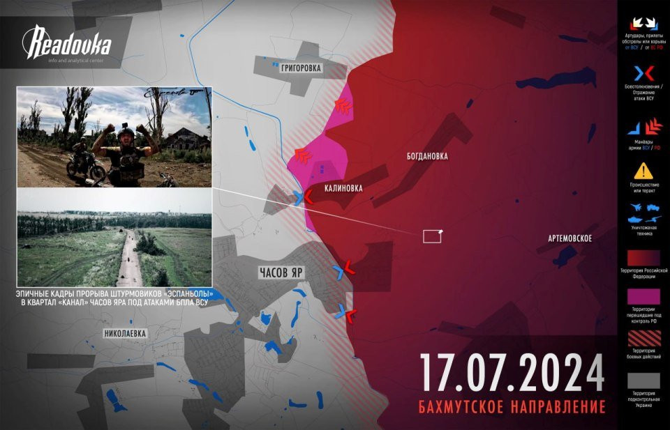 Под Часов Яром ВС РФ выбили противника из урочища Орлова и из восточной части Калиновки. После чего русская армия продолжила наступление в сторону Григоровки. Также к этому селу наши бойцы выдвинулись и со стороны Богдановки. Севернее Григоровки находится рудник и его высоты, за которые ВСУ и попытаются зацепиться, пишет Readovka.