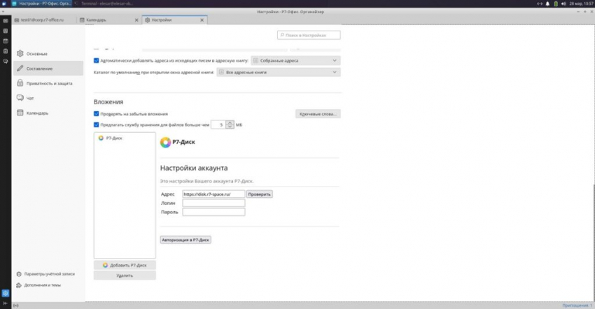 Для этого необходимо перейти в «Органайзер», открыть «Настройки» и в левой панели выбрать пункт «Составление». В открывшемся окне в разделе «Вложения» следует поставить галочку рядом с пунктом «Предлагать службу хранения». Рядом в окошке выбора можно задать размер файлов, которые будут направляться на хранение в «Р7-Диск». Ниже в этом окне следует нажать на кнопку «Добавить Р7-Диск».