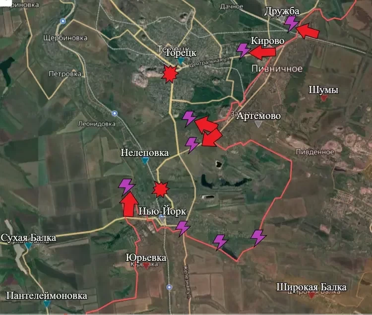 На Торецком направлении противник отступает в районе Нью Йорка (Новгородского), а ВС РФ зачищают северо-восточную часть города. В Кирово нашим бойцам удалось выйти к Северная - здесь у ВСУ был мощный укрепрайон. Продолжаются бои в пригороде Торецка.