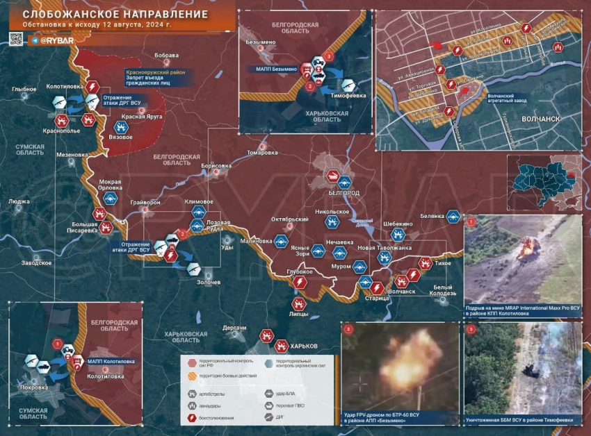 Однако главным событием стала попытка прорыва границы России сразу на двух новых участках. Утром в окрестностях села Гирьи Беловского района Курской области местные жители заметили колонну украинской бронетехники, которая вскоре была сожжена. Подобная участь ждала и «вторженцев» под Колотиловкой Краснояружского района Белгородской области.