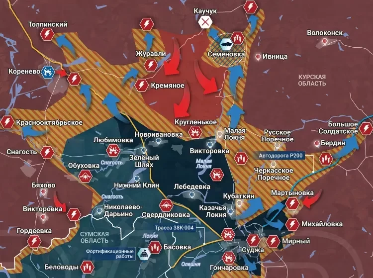 Враг атакует позиции ВС РФ в районе Коренево, но получает отпор и с потерями откатывается назад, если вообще есть кому откатываться. Со вторженцами у нас не особо церемонятся. Задача противника на этом учатся - выйти через любимовку на Коренево, а далее – на Курчатов, где находится Курская АЭС.