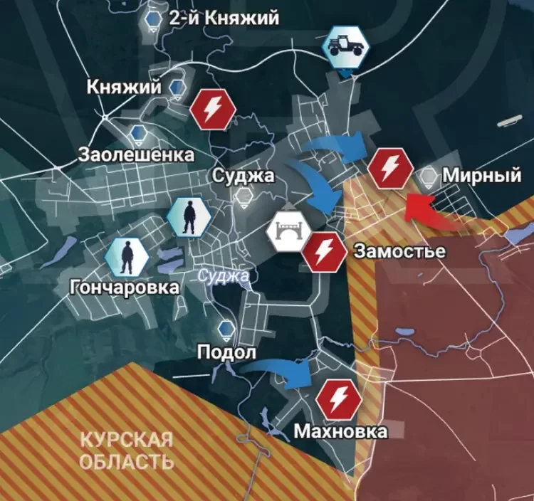 Судьба Суджи остаётся неизвестной. Предположительно, город находится в "серой зоне". Вчера было очень много сообщений с этого района, которые довольно сильно разнятся. Разные источники сообщают совершенно разную информацию о контроле над населённым пунктом. Например, Рыбарь, карты которого используются в сводке для Курского направления, утверждает:
