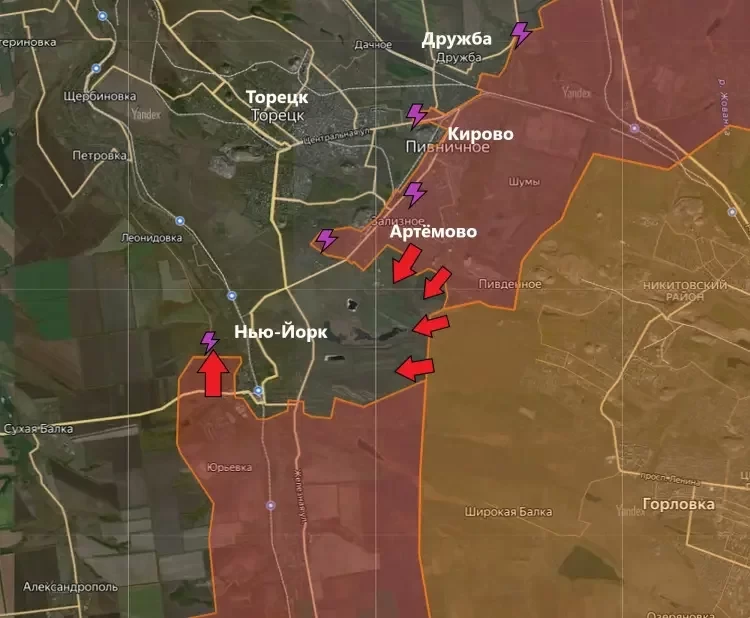 Кроме того, южнее Торецка вся северо-восточная часть Нью-Йорка перешла под контроль российских сил. На этом участке противник бежит уже и из полукотла в соседнюю Нелеповку. Те подразделения, которые перебрасывались для обороны населённого пункта - 53, 41, 32 ОМБр, уже заканчиваются.