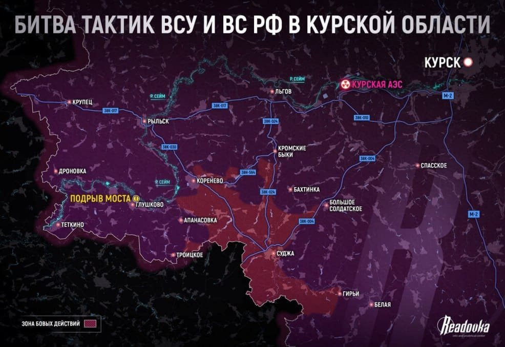Противник в Глушковском районе уничтожил основой мост через реку Сейм, затруднив не только логистику ВС РФ, но и эвакуацию мирного населения. Также враг ударил по мосту в селе Званное, показав свое намеренье атаковать Глушковский район. ВСУ сумели взять под контроль большую часть города Суджа с ж/д путями, идущими от Льгова на Белгород, но продвинуться дальше вглубь региона они не могут.