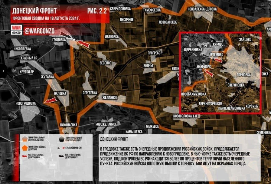 Обновлённая карта боевых действий на Украине по данным на 13:00 мск сегодня, 18.08.2024