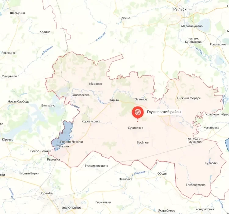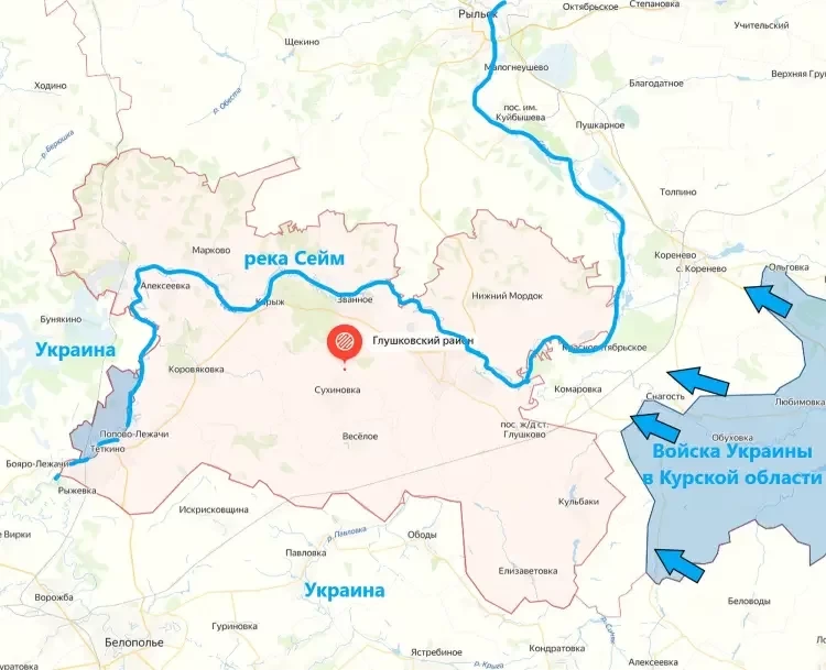 Если посмотреть на карту, то можно понять, в чём проблема. Река Сейм отсекает большую часть Глушковского района от севера. На запада и юге - граница с Украиной. С востока пытаются пробиться ВСУ, расширив зону контроля в Кореневском районе. Также я выделил реку более жирным. Она является водной преградой и существенно осложняет положение дел.
