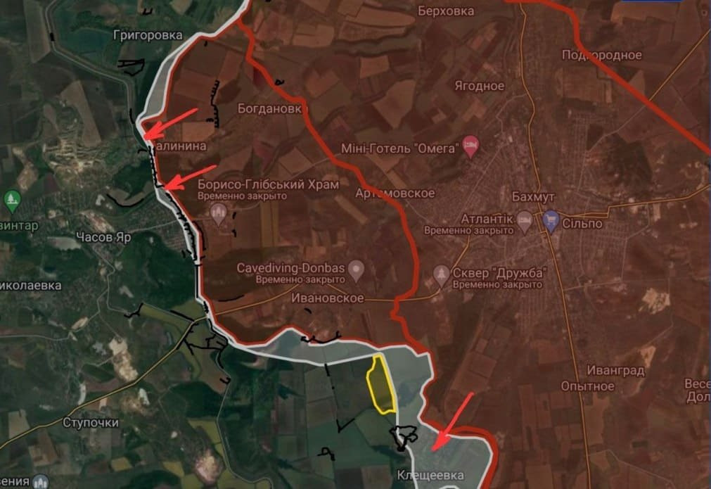 На Артемовском направлении у Клещеевки ВС РФ отбили несколько позиций противника и продолжают оттеснять боевиков ВСУ к каналу Северский Донец-Донбасс. Об этом военкор Евгений Лисицын сообщает в своем Telegram-канале.