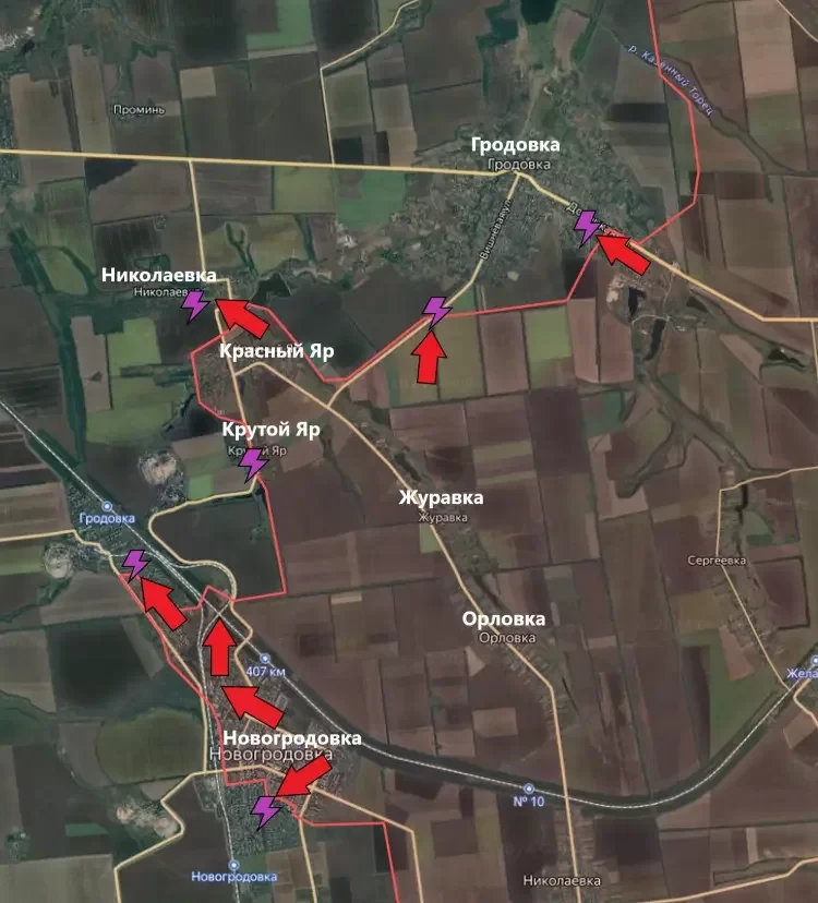 Также успехи ВС РФ наблюдаются и в зоне между Гродовкой и Новогродовкой. Сообщается, что подразделения ВС РФ полностью зачистили Красный Яр и Крутой Яр, после чего начали штурм населённого пункта Николаевка.