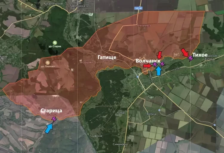 На восточном участке бои идут близ Старицы и в Волчанске. В последнем обстановка остаётся стабильно напряженной. ВС РФ воздерживаются от ведения активных наступательных действий и сосредоточены на выявлении и поражении позиций противника в городской застройке.