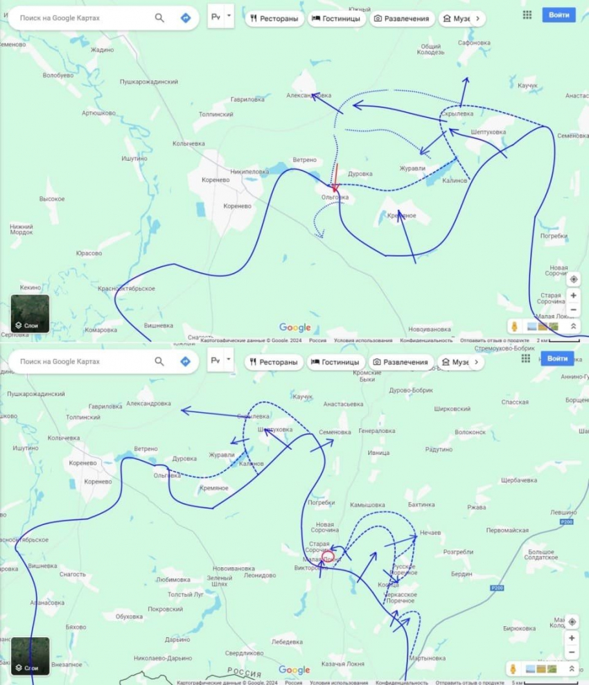 Чуть севернее ситуация уточняется. Некоторые источники сообщают, что Ольговка и Кремяное перешли под контроль ВСУ, а другие источники - что оборона ВС РФ там ещё держится. К сожалению, первый вариант наиболее вероятен.