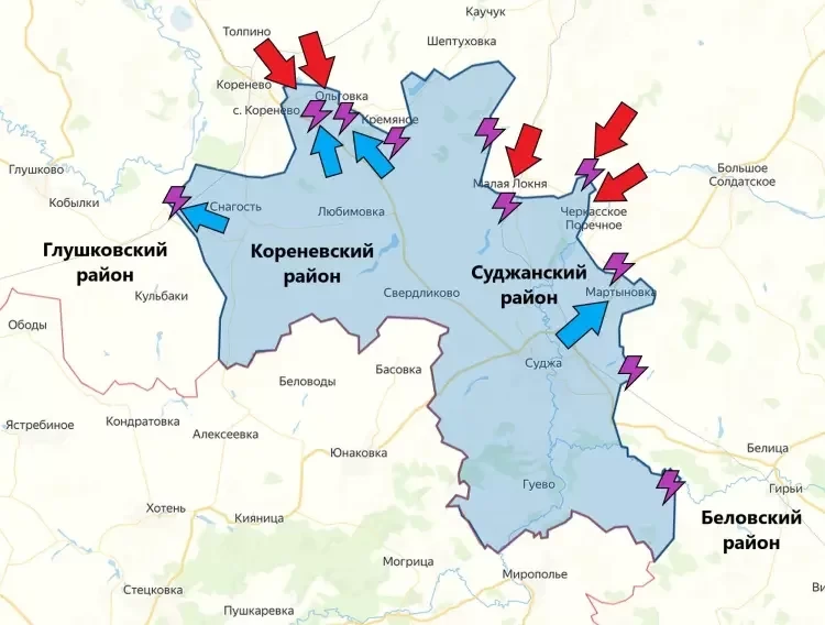 В Суджанском районе бои идут у Малой Локни. Предположительно, сейчас населённый пункт находится в “серой зоне”. Несколько дней назад появилась информация, что ВСУ смогли выбить ВС РФ с позиций в Малой Локне, однако позже поступили сообщения, что село вновь перешло под контроль ВС РФ. Северо-западнее Малой Локни ВСУ атакуют в районе Погребков. Также идут позиционные бои в восточной части места прорыва ВСУ в Курской области.