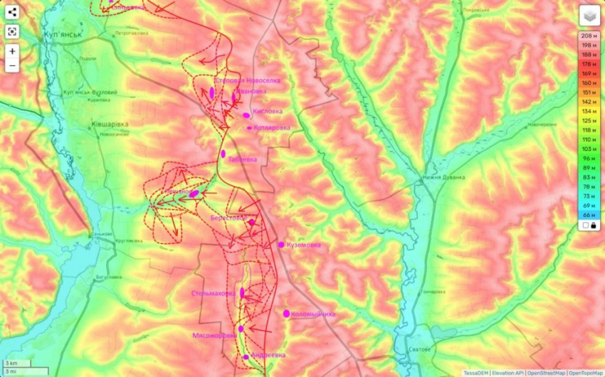 На Купянском направлении также, как и чуть южнее на Лиманском направлении наша 1 ТА пытается «вымучить» победу, прорывом фронта противника и выходом на рубеж реки Оскол.