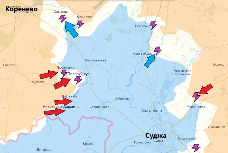 В Суджанском районе встречные бои идут у Погребков, Малой Локни, Мартыновки и некоторых других населённых пунктов. Однако, продвижением не может похвастаться ни одна из сторон.