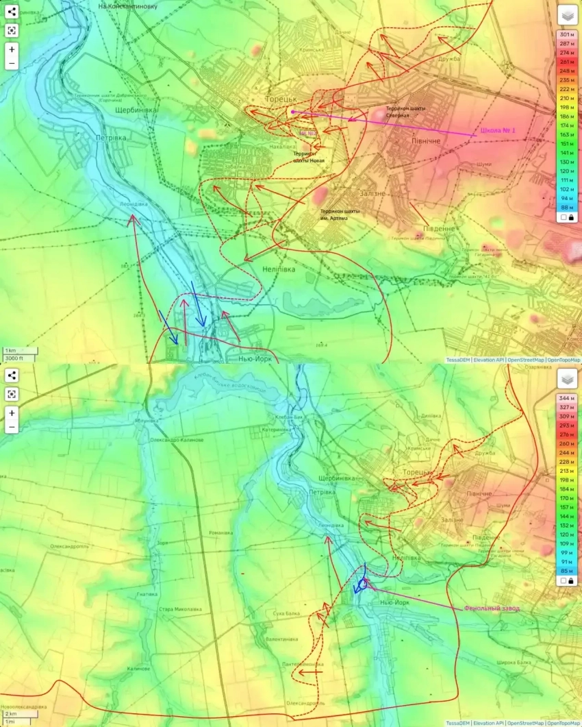 И такой удар был вчера произведен. Пока неясно, как на сейчас выглядит ситуация (сумели ли мы закрепиться или нет), но вчера наши штурмовики были замечены в Леонидовке. Занятие Леонидовки станет приговором, находящейся южнее Нелиповке. А еще, опираясь на Леонидовку мы сможем нанести удар на Петровку, что станет приговором гарнизону Торецка в относительно изолированном микрорайоне Забалка.