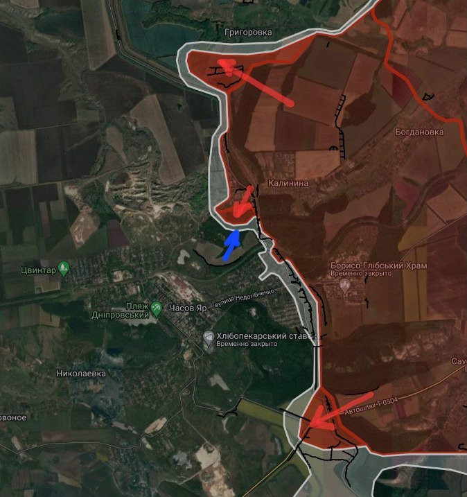 На ЧасовЯрском направлении на северном фланге, южнее Григоровки, ВС РФ заняли ротный опорный пункт, за который ранее шли бои, и продвинулся в южной части урочища Тарасово на глубину до 1.18 км.