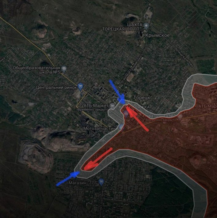На Торецком направлении В Торецке российские войска продолжают продвигаться вдоль улиц Чкалова и Парижской Коммуны. Идут встречные бои, сообщает Telegram-канал "БелВПО".