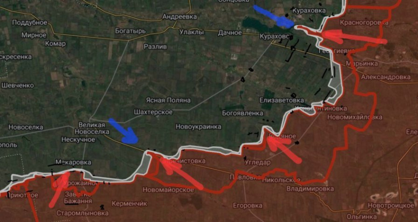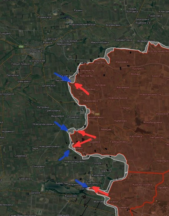 Южнее Селидово ВС РФ продвинулись вдоль северной лесополосы балки Лозовая на глубину до 450 м и предприняли попытку продвинуться вдоль соседней лесополосы в направлении Селидово, закрепиться там не удалось.