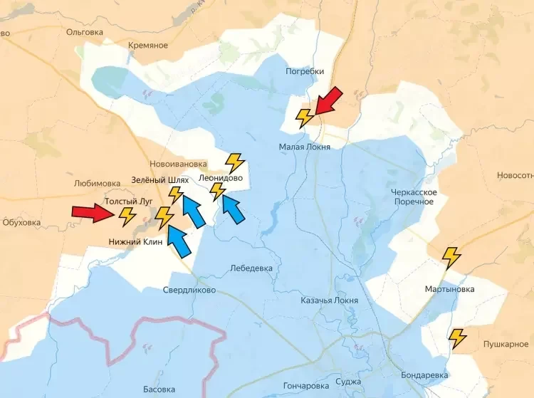 Довольно интересно выглядит обстановка на северном участке. От недавно взятого ВС РФ Леонидово до Малой Сорочины - около 5,5 км, а до Малой Локни, за которую сейчас идут бои, около 4 км. Об этом сообщает PulsePen.