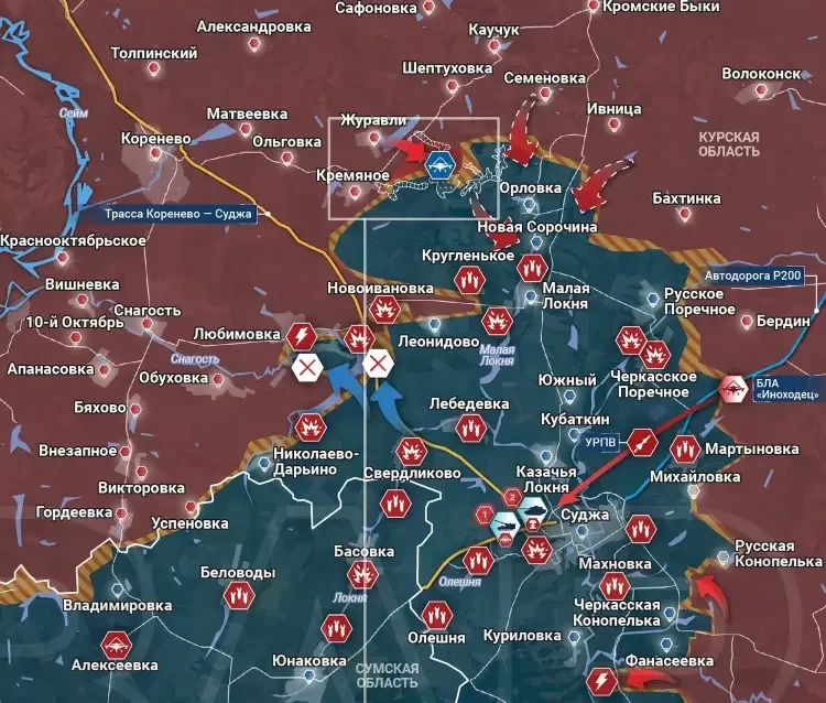 В свою очередь Telegram-канал "Два майора" пишет о том, что в Курской области противник днём перебрасывал технику в район Новоивановки-Кругленького, потеряв несколько единиц техники на минных заграждениях и от огня нашей артиллерии. По всей линии боевого соприкосновения наши операторы FPV-дронов и серийных БПЛА «Иноходец» уничтожали вражескую бронетехнику, в т.ч. американского производства (БМП «Бредли»). Контратаки ВСУ в северо-западной части вклинения могут объясняться необходимостью окопаться и укрепить свои позиции в районе н.п. Леонидово во избежание дальнейшего провала обороны. В Глушковском районе у н.п. Новый Путь в лесном массиве уничтожена группа пехоты противника.