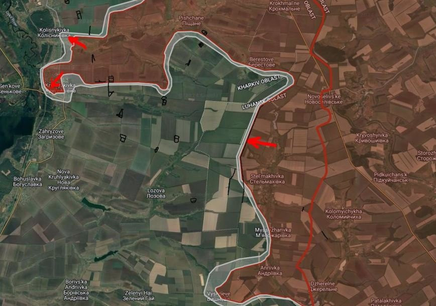 На Купянско-Лиманском направлении ВС РФ имеют тактические успехи на восточной окраине Колесниковки севернее р. Песчаная. В Кругляковке российские войска расширили контроль территории и продвинулись вдоль ул. Сосновая на глубину до 200 м., давят в южном направлении. Западнее Стельмаховки ВС РФ продвинулись вдоль на участке шириной до 4.87 км на глубину до 1.7 км.