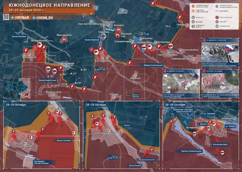 На Донецком направлении ВС РФ ведут бои на подступах к Курахово, а также в Кураховке и западных окраинах Зоряного. На Южнодонецком направлении штурмовики освободили Шахтерское и Богоявленку, а также вошли в Ясную Поляну, продолжаются бои на западной окраине Катериновки, сообщает Telegram-канал "Рыбарь".