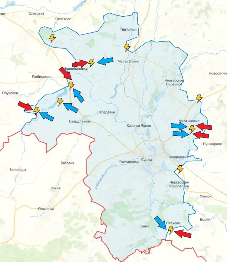 На восточном участке идут встречные бои в районе Мартыновки и Михайловки. Также ВСУ предприняли попытку контратаки в районе села Плёхово, которое, вопреки сделанным ранее заявлениям, находится под контролем ВСУ.