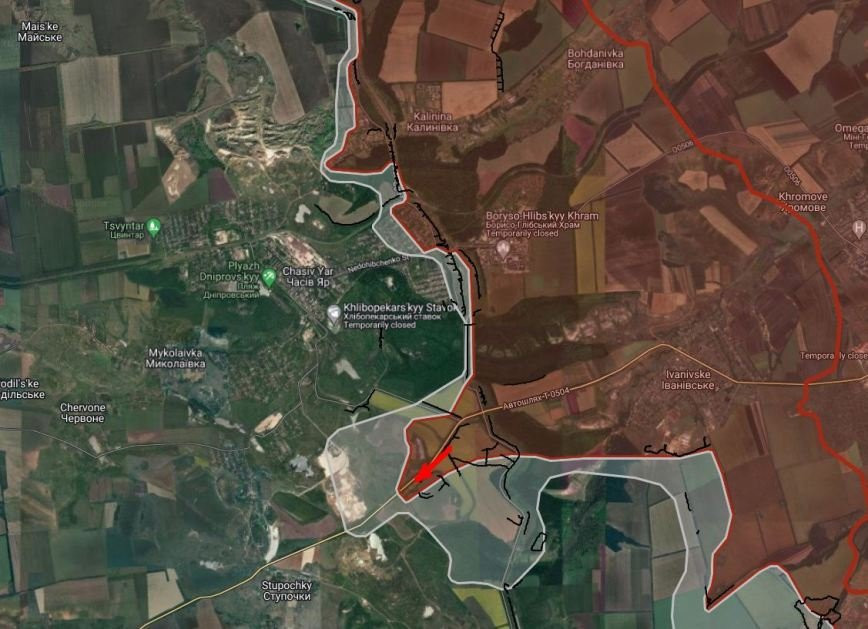 На ЧасовЯрском направлении ВС РФ ведут штурмовые действия южнее Часов Яра в направлении Ступочки.