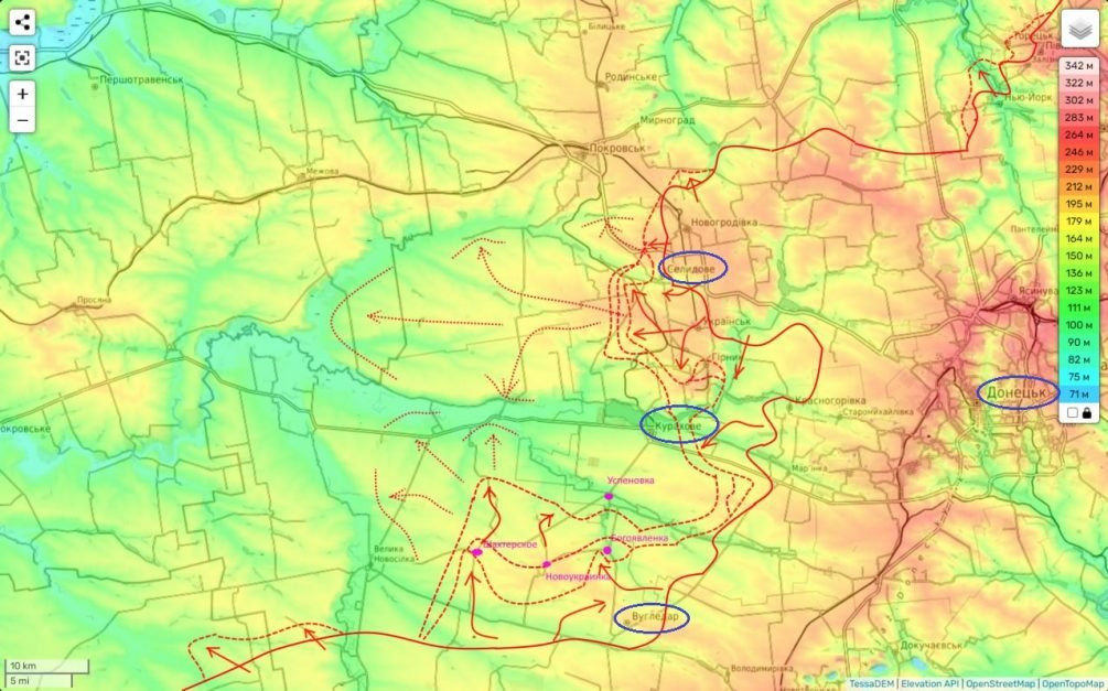 Недавно поступила информация о том, что наши войска взяли под контроль Новоалексеевку, расположенную западнее Селидово. Судя по активным действиям, наше командование планирует гораздо более масштабную наступательную операцию, чем просто отсечение Курахово от снабжения с севера. Вероятно, речь идет о захвате междуречья рек Солёная и Волчья с дальнейшим продвижением в Днепропетровскую область и отсечением Покровской агломерации ВСУ от снабжения со стороны Днепропетровска.