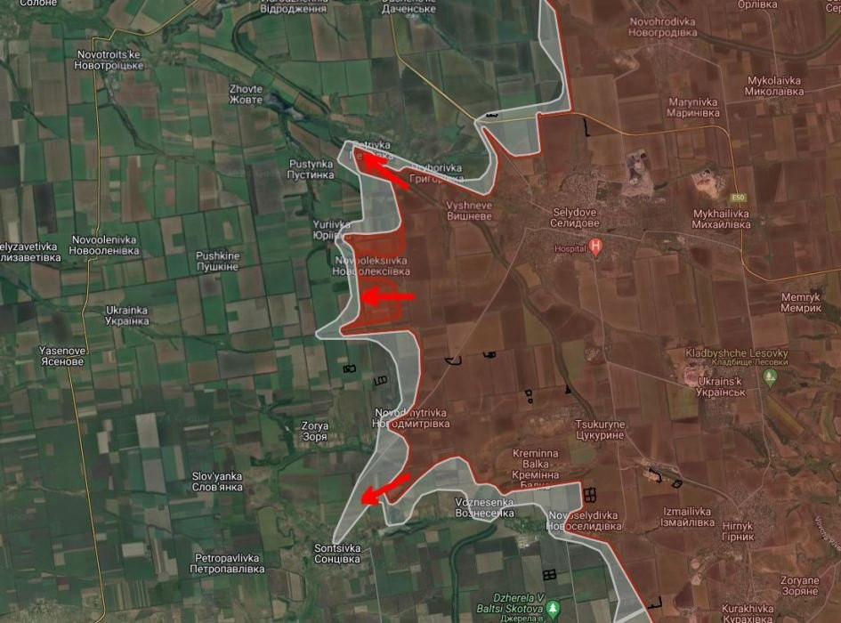 На Покровском направлении ВС РФ продвинулись в южной части Петровки на глубину до 350 м, севернее Новоалексеевки в направлении Юрьевки на глубину до 850 м, южнее Новоалексеевки на участке шириной до 1.4 км и в Новоселидовке на глубину до 400 м.