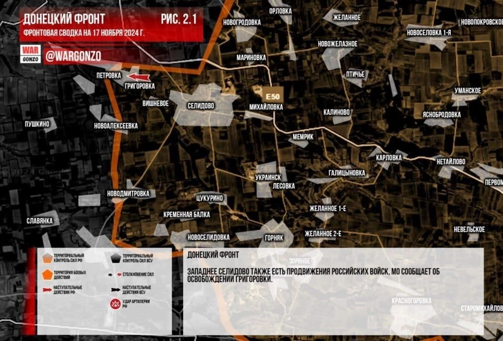 По данным канала, российские военные установили контроль над оставшейся северной частью села Григорьевка и продолжают штурмовые действия в селе Петровка, которое находится рядом. В Минобороны РФ данную информацию пока не комментировали.