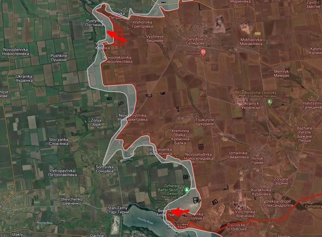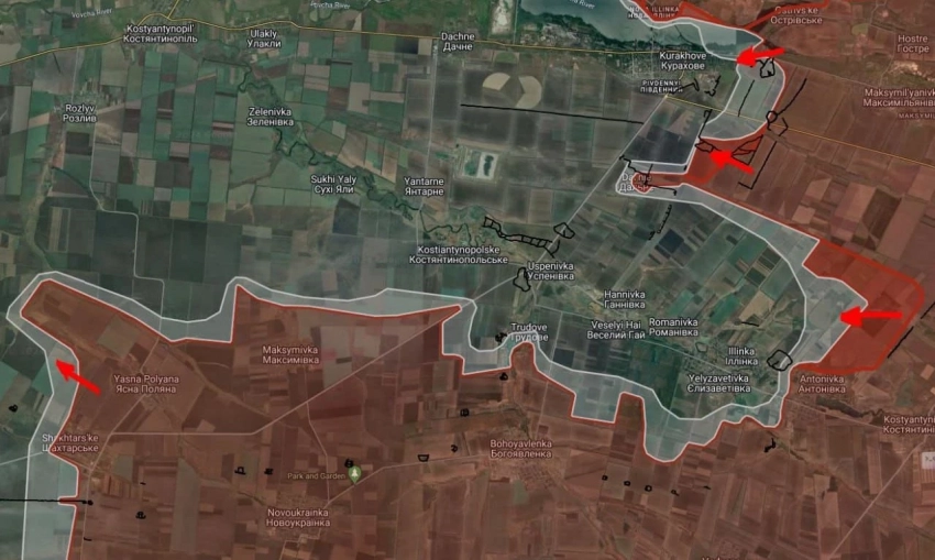 Российские войска расширили контроль территории вдоль северного берега Кураховского водохранилища в направлении Берестки.