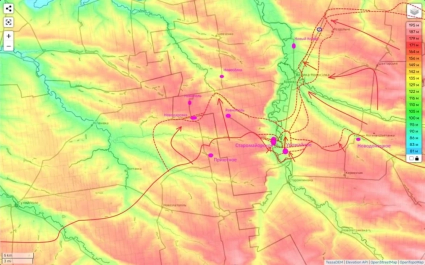 Причем, наши части, несмотря на то, что в ходе боев они зашли немного и в сам этот н.п. (в северо-восточной его части), уже очевидно нацелены чуть севернее - на Новый Комар (и возможно даже ещё севернее).