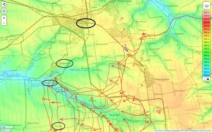 На Покровском направлении наблюдается значительное усиление давления со стороны российских войск между населёнными пунктами Шевченко и Пушкино. До первого из указанных населённых пунктов осталось пройти менее километра, в то время как из Пушкино наши части уже выбили противника и продолжают продвижение к важной трассе Покровск-Курахово, находящейся всего в трёх километрах.