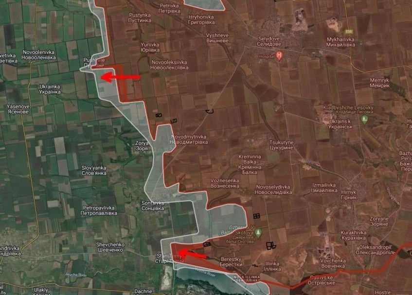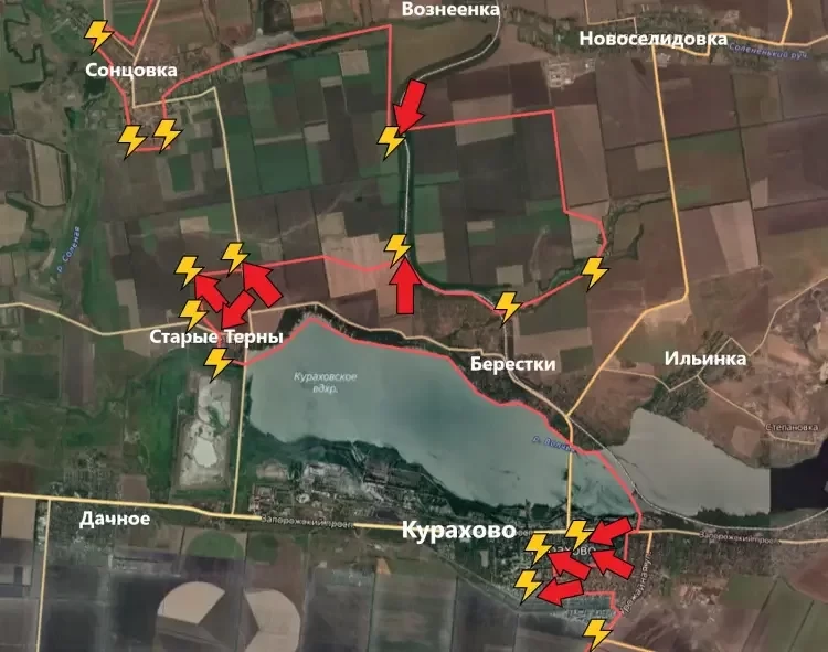 Штурмовые отряды Армии России зашли в Старые Терны, которые располагаются на северо-западе от Кураховского водохранилища. Как минимум половина этого скромного населённого пункта за нашим бойцами. Можно ли будет продвигаться отсюда на юг, пока не очень понятно. Известно, что несколько недель назад ВСУ подорвали дамбу на этом участке. А вот дорога снабжения ВСУ (через Дачное на Курахово) находится под нашим огневым контролем.