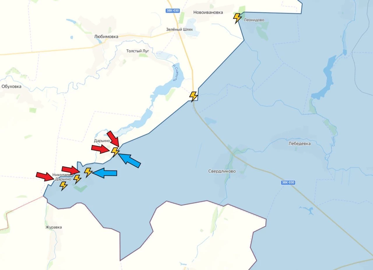 Ряд источников сообщает о контратаках ВСУ в районе Дарьино и Николаево-Дарьино. Как информирует PulsePen, Дарьино находится под контролем ВС РФ, вражеская атака отбита. Николаево-Дарьино - серая зона, идут встречные бои.