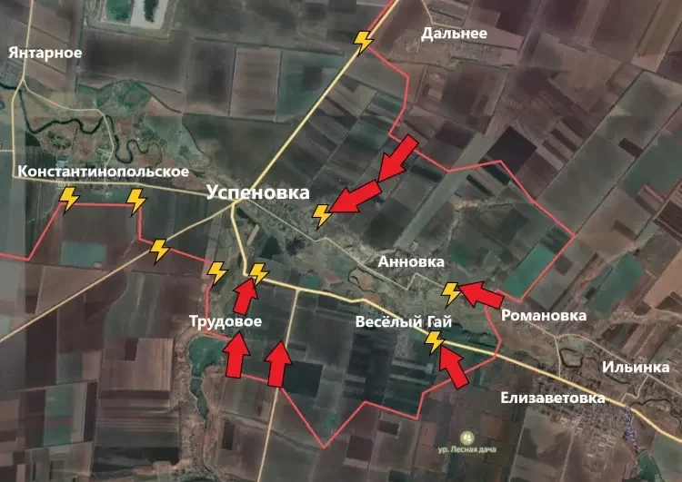 На Успеновском направлении произошло важнейшее событие произошло на участке. Подразделения ВС РФ прорвали оборону ВСУ и прорвались из Дальнего на северо-восточные окраины Успеновки в район сельскохозяйственных построек. Идёт закрепление на позициях. Враг контратакует. Угроза физического окружения противника в Анновке и Весёлом Гае реальна. ВСУ наносят удары дронами, пытается отбить ферму и оттеснить наши подразделения. В целом ситуация для противника в «успеновском кармане» действительно критическая. Вполне вероятно, что подразделения 79-ой бригады ВСУ вынуждены будут отходить с боями из Зелёного Гая и Анновки к Успеновке, если в ближайшие часы ситуация не улучшится.