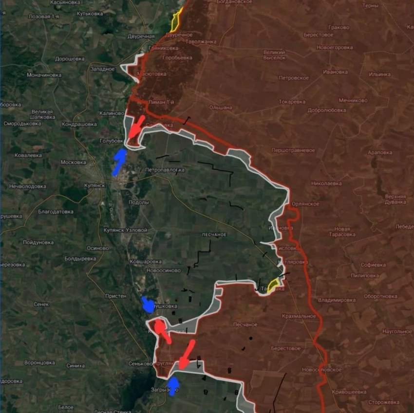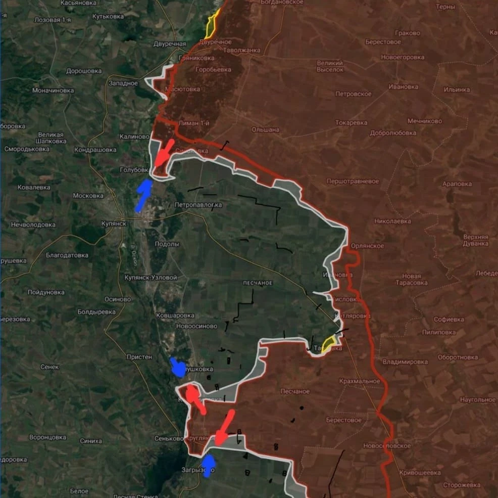На Купянско-Лиманском направлении ВСУ пытаются контратаковать в районе плацдарма у р. Оскол, ВС РФ ведут наступательные действия на восточной окраине Купянска. В районе Первомайского ВС РФ расширили зону контроля до 1 км.
