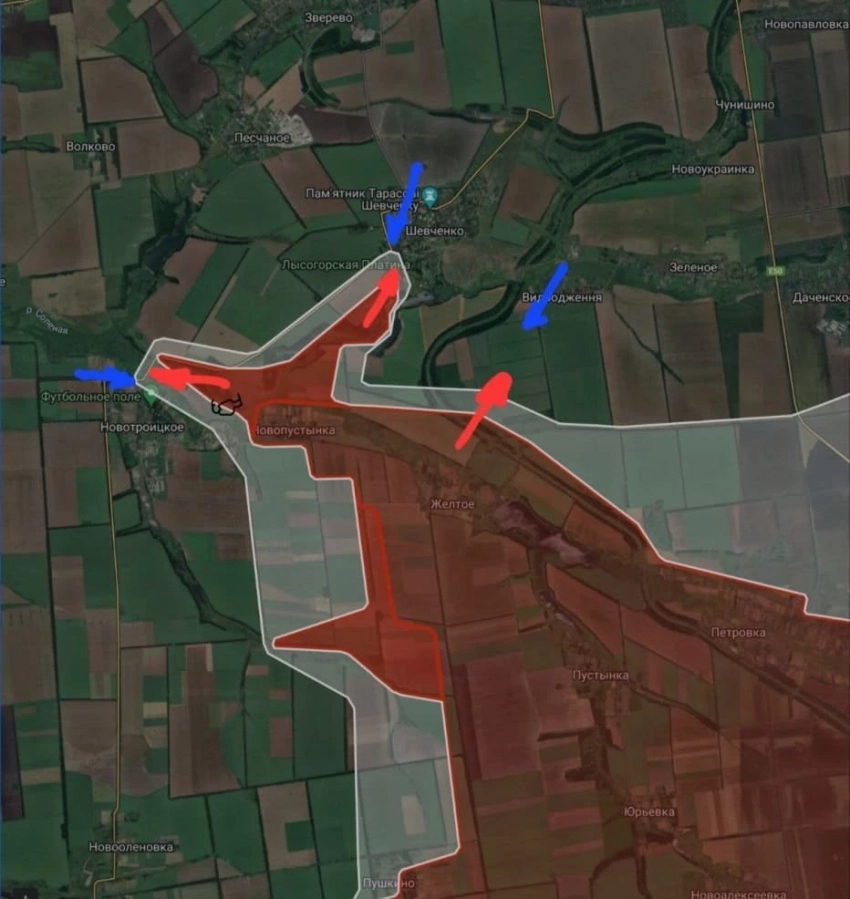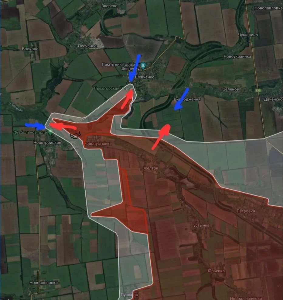 На Покровском направлении ВС РФ продвинулись в юго-западной части н.п. Шевченко и вдоль лесополосы в направлении н.п. Новый Труд, продолжают давить в направлении Даченского, под Лысовкой и в районе Новотроицкое.