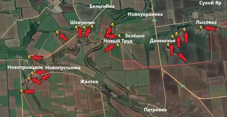 В Солнцевке российские войска имеют тактические успехи, продвинулись в центральной части населенного пункта на глубину до 700 м. Южнее Вознесенки под контроль ВС РФ перешел участок местности шириной до 2.05 км. Также российские войска ведут штурмовые действия южнее Старых Тернов, давят в направлении Дачное.