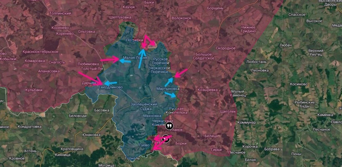 Ближе к Судже серьёзные бои продолжаются на окраинах Мартыновки, ВСУ пока отбивают атаки наших и сами пытаются контратаковать.