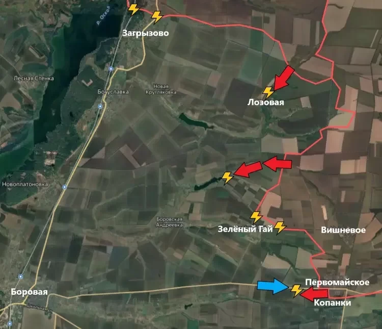 На Боровском направлении продолжаются встречные бои на северных подступах к Загрызово. Подразделения ВС РФ подобрались к Лозовой с севера. Наши бойцы вплотную подошли к административным границам села. Вполне вероятно, что в скором времени начнётся штурм. Армия России существенно продвинулась в полях между Лозовой и Зелёным Гаем. В районе Зелёного Гая также идут бои. ВСУ продолжают устраивать накарты на наши позиции в Первомайском и Копанках. Наши бойцы отражают контратаки противника. Контроль над Копанками на текущий момент под вопросом.