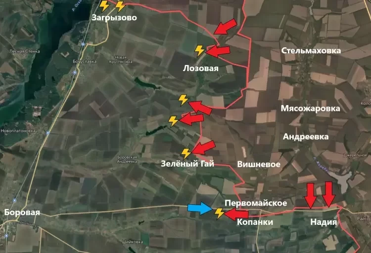 На Боровском направлении подразделения ВС РФ продолжают окружение Лозовой - продвижение есть как с северного, так и с южного фланга. Идут бои на подступах к Зелёному Гаю. Встречные бои (с контратаками ВСУ) зафиксированы в районе Первомайского и Копанок. Наши бойцы закрыли карман восточнее Первомайского, продвинувшись в направлении Надии.