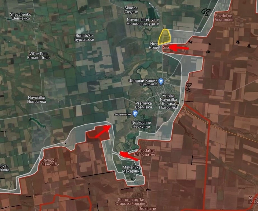 На Великоновосёлковском направлении ВС РФ расширили контроль территории в направлении Нов.Комар, ведут штурмовые действия в юго-восточной части населенного пункта, информирует Telegram-канал "БелВПО".
