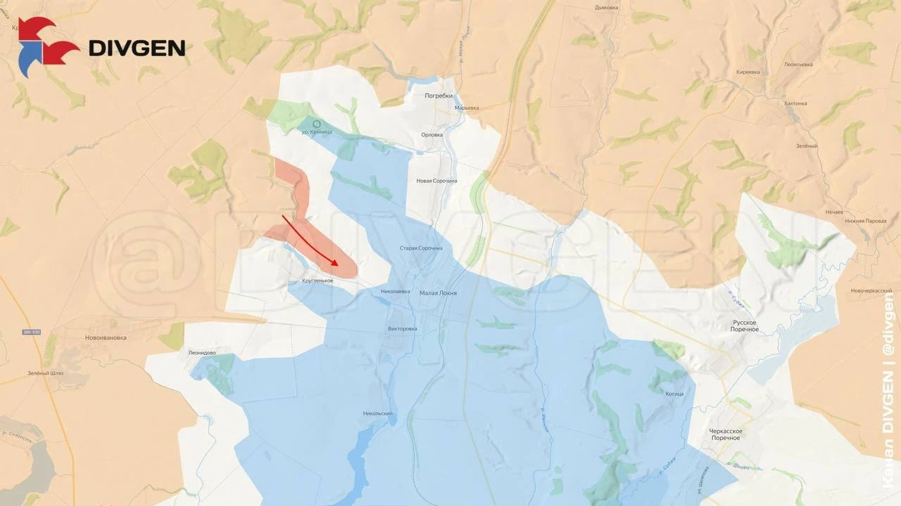 Подробнее о том, что происходит западнее Малой Локни. Сообщается, что наши штурмовые отряды зашли в Кругленькое. Бои ведутся в центре села.