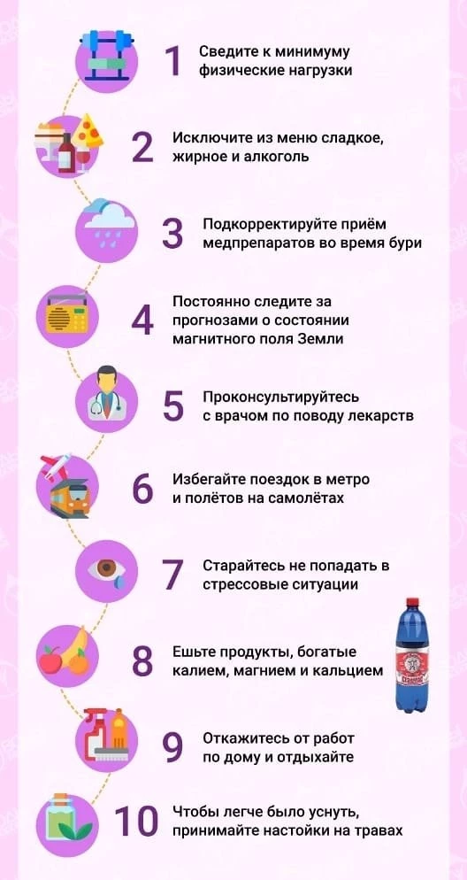 По мнению специалиста, на период магнитной бури необходимы регулярный прием назначенных врачом препаратов, ежедневные прогулки на свежем воздухе не менее 30-40 минут и умеренная физическая активность. Кроме того, врач рекомендует сократить потребление жирных и жареных блюд, уменьшить количество сладостей и полуфабрикатов в рационе, а также включить в питание продукты, богатые магнием и калием.