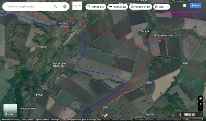 Если продолжать атаковать по вчерашней схеме (отталкиваясь от Черкасского Поречного забрасывать пополнения на окраины Бердина и Новосотницкого, то может так случиться, что ВС РФ прорвутся в южную часть Русского Поречного и перейдя речку Суджу (а ее сейчас несложно перейти пешком), выйдут прорвавшимся частям ВСУ в тыл и прочно обрежут им все возможные способы коммуникаций.